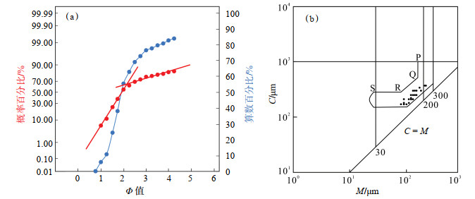 下载原图 图 2 东营凹陷林樊家油田林东地区L6-9井粒度概率累积曲线(a)和C—M图(b) 注:S段(RS段)为均匀悬浮沉积;R段(QR段)为递变悬浮沉积;Q段(QR段末端)为递变悬浮向均匀悬浮过渡;P段(PQ段)为悬浮与滚动混合搬运;C为粒度累积曲线上颗粒质量分数达到1% 时对应的粒径,μm;M为粒度累积曲线上颗粒质量分数达到50% 时对应的粒径,μm。 Fig. 2 Grain size cumulative probability curve(a)andC—M diagram(b)of well L6-9 in Lindong area of Linfanjia Oilfield, Dongying Sag |