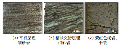 (1)泥质层。研究区网状河具有典型的“泥包砂”剖面特征,大多数河道的横向沟通较弱,呈孤立样式,其间被河道间的泥质沉积物分隔[40]。这种泥质沉积物(泥质层)岩性以泥岩、粉砂岩沉积为主,常见泥质粉砂岩、砂质泥岩互层,泥岩颜色主要为紫色,是识别2期河流沉积的重要标志(图 8a),其测井曲线最明显的特征是高SP和低电阻率。