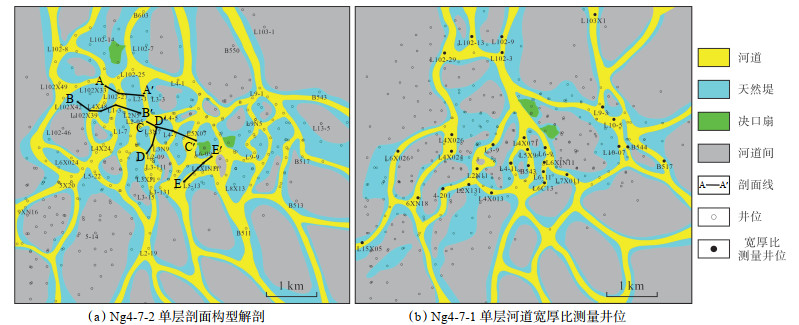 (2)沉积相变。河道两侧一般均发育有天然堤,所以可以根据河道与天然堤不同的沉积粒度及电测井曲线特征,识别出不同河道。如L102X39井与L1-3井馆四段7-2单层均为河道微相,L4X28井馆四段7-2单层为明显的天然堤微相,L4X28井位于L102X39井与L1-3井之间(见图 10中BB'剖面),说明L102X39井与L1-3井钻遇砂体为2条不同的河道砂体,中间被天然堤分隔开。