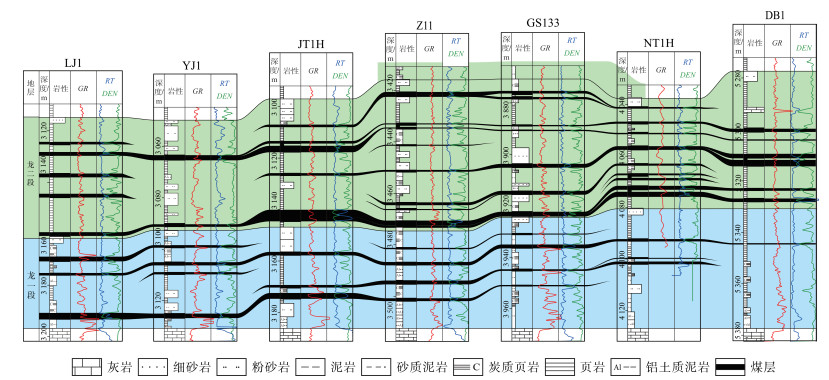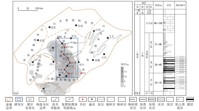 四川盆地晚二叠世总体沉积于伸展背景,晚二叠世加里东运动和峨眉山玄武岩事件导致四川盆地吴家坪组出现沉积分异格局,从盆地西南部到东北部依次发育峨眉山玄武岩和陆相宣威组、海陆过渡相龙潭组、海相吴家坪组,平面上依次出现河流相、滨岸沼泽相、潮坪—潟湖相、浅水陆棚相、深水陆棚相等沉积相[16]。研究区位于盆地中部,处于龙潭组滨岸沼泽相沉积体系,沉积了一套灰黑色泥页岩和粉砂岩为主夹煤岩的海陆过渡相岩石组合。龙潭组厚度为100~200 m,埋深为2 500~4 500 m,其与下覆茅口组灰白色泥晶灰岩呈平行不整合接触,与上覆长兴组灰白色石灰岩和深灰色泥页岩呈整合接触(图 1b)。遂宁—合江地区龙潭组岩性组合三分性特征明显,下部龙一段自下而上发育铝土质泥岩、灰黑色泥页岩、浅灰色砂岩夹薄煤岩;龙二段发育深灰色页岩、砂质页岩,灰黑色炭质页岩,浅灰色泥质砂岩,夹多套煤层;龙三段发育浅灰色砂岩、粉砂岩,深灰色泥页岩,浅灰色灰质页岩、砂质页岩,部分地区为灰岩。