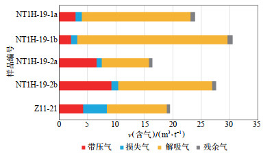 煤岩的总含气量和游离气含量能直接表征其含气性特征,是反映煤层气开发效果的关键性参数。本次研究对NT1H井19号煤岩与Z11井21号煤岩开展保压密闭取心和煤岩现场含气量测试(图 10),并在室内开展等温吸附实验获取煤岩吸附气含量(图 11),NT1H井19号煤岩总含气质量体积为16.40~30.50 m3/t,平均值为24.60 m3/t。考虑含水饱和度校正后煤岩吸附气质量体积为9.90~ 21.55 m3/t,平均值为18.35 m3/t,游离气质量体积为7.12~11.34 m3/t,占总含气量的25.80%~37.10%(表 1)。对Z11井煤岩含气量测试结果计算表明,煤岩含气质量体积为19.50 m3/t。浙江油田对大安地区2口井龙潭组煤岩开展保压取心含气量测试[35],H2-6井(保压失败)实测含气质量体积达到16.60~17.60 m3/t,最大吸附含气质量体积为11.04~12.77 m3/t;D2井保压实测含气质量体积为24.42~38.03 m3/t,煤岩等温吸附实验预测最大吸附含气质量体积为22.01~26.87 m3/t,游离气占总含气量的8.24%~29.34%。鄂尔多斯盆地煤岩埋深1 500 m时出现游离气,埋深1 800~2 600 m时含气质量体积为22.00~32.00 m3/t,游离气占含气量约20%[36],相比之下遂宁—合江地区龙潭组深层煤岩具有较高的含气量和游离气比例,含气性较好。
