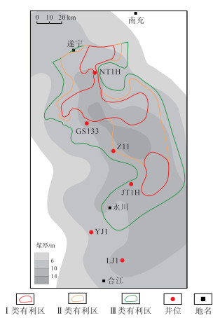 下载原图 图 12 四川盆地遂宁—合江地区二叠系龙潭组煤岩气勘探有利区分布 Fig. 12 Distribution of favorable area for coal-rock gas exploration of Permian Longtan Formation in Suining-Hejiang area, Sichuan Basin |