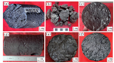 下载原图 图 3 四川盆地遂宁—合江地区二叠系龙潭组煤岩岩心照片 (a)光亮煤,见镜煤条带,割理发育,NT1H井,4 319.18 m;(b)光亮煤—半亮煤,碎裂结构,NT1H井,4 303.00 m;(c)半亮煤,发育多组微裂缝,部分裂缝被方解石充填,YJ1井,3 050.41 m;(d)半暗煤为主,受构造应力作用产生多组剪切裂缝,部分裂缝被方解石充填,Y101H31井,2 731.44 m;(e)半亮煤,黏土矿物含量较高,发育多处微裂缝,Z11井,3 479.35 m;(f)光亮煤,面割理和端割理发育,LJ1井,3 119.00 m。 Fig. 3 Core photos of coal rock from Permian Longtan Formation in Suining-Hejiang area, Sichuan Basin |