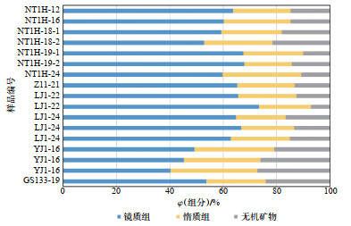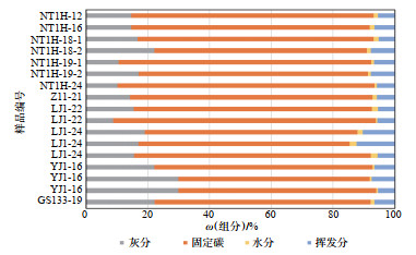 煤岩的工业分析包括煤的灰分、固定碳、水分和挥发分,其中灰分代表煤岩中无机矿物的含量,而固定碳代表了煤岩中有机质的性质和含量[21]。龙潭组煤岩的工业分析实验结果(图 5)表明,煤岩的灰分质量分数为8.71%~29.86%,平均值为17.58%,属于低—中灰分煤;固定碳质量分数为62.09%~85.12%,平均值为74.29%;挥发分质量分数为6.06%~ 14.68%,平均值为8.12%;水分质量分数为0.53%~ 2.34%,平均值为1.27%。NT1H井19号煤具有较高的固定碳含量(质量分数为78.17%)和较低的灰分含量(质量分数为13.71%),有机质含量高,无机矿物含量低,与大吉地区本溪组8号煤品质相当,具备较强的生烃能力。YJ1井和GS133井煤样固定碳含量较低,灰分含量明显升高,煤岩含较多无机矿物,不同地区煤岩煤质差异较大,发育从特低灰分—高灰分煤岩,纵向上不同煤层灰分含量也不同,以19号煤和22号煤品质最优。