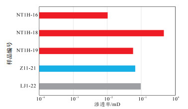 2.3.2 物性煤样的氦气饱和度法测试结果显示,遂宁—合江地区龙潭组煤岩孔隙度体积分数为5.78%~ 11.56%,平均值为7.66%(图 6)。NT1H井、Z11井和LJ1井等3口井龙潭组煤岩的渗透率为0.010 3~ 0.462 6 mD,平均值为0.138 9 mD(图 7)。实验结果表明,遂宁—合江地区不同井龙潭组煤岩物性横向上变化快,不同煤层也具有非均质性。各个煤岩小层中,NT1H井19号煤岩的渗透率和孔隙度均较高,孔隙度为8.30%,渗透率为0.057 6 mD,为物性最好的煤层。煤岩的渗透率决定了煤层气的流动性,NT1H井19号煤岩的高孔隙度和较高渗透率,表明其具有良好的储集和渗流能力,有利于后期压裂改造和渗流。