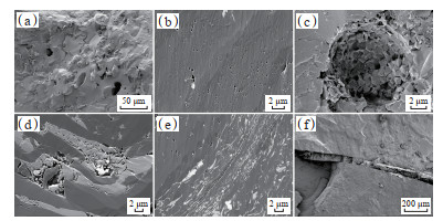 下载原图 图 8 四川盆地遂宁—合江地区二叠系龙潭组煤岩孔隙和裂隙的扫描电镜照片 (a)煤岩内部见较多胞腔孔,4 288.87 m;(b)煤岩局部发育气孔,孔径 > 50 nm,4 324.38 m;(c)铸模孔内发育黄铁矿晶粒,4 323.19 m;(d)黏土、石英等无机矿物之间发育粒间孔,4 395.30 m;(e)剪切缝,见大量黏土矿物沿裂缝方向定向排列,左上角见矿物溶蚀孔,4 319.46 m;(f)张性裂缝,见黏土矿物填充,4 318.87 m。 Fig. 8 Scanning electron microscope photos of pores and cracks of coal rock from Permian Longtan Formation in Suining-Hejiang area, Sichuan Basin |