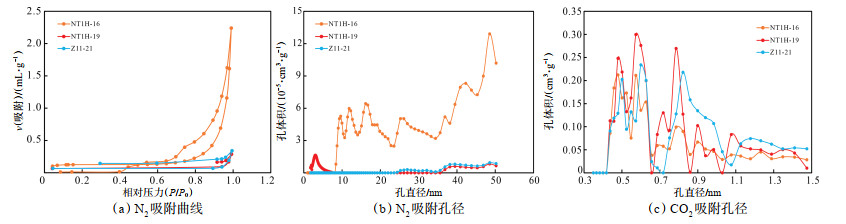 下载原图 图 9 四川盆地遂宁—合江地区二叠系龙潭组煤岩低温N2和CO2吸附曲线 Fig. 9 Adsorption curves of low-temperature N2 and CO2 of coal rock from Permian Longtan Formation in Suining-Hejiang area, Sichuan Basin |