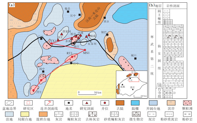 下载原图 图 1 四川盆地北缘寒武系仙女洞组岩相古地理(a)及岩性地层综合柱状图(b)(据文献[20-21]修改) Fig. 1 Lithofacies paleogeography of Xiannüdong Formation(a)and stratigraphic column of Cambrian(b)in northern Sichuan Basin |