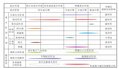 研究区强烈的胶结作用、压实压溶作用及重结晶作用对碳酸盐岩储层具有极大破坏性[49](图 10)。同生期形成的早期胶结物占据了储层的绝大部分空间,岩石致密化程度变高,原生孔隙难以有效保存(图 9a—9c)。埋藏环境下,压实作用会使颗粒与颗粒、颗粒与胶结物、胶结物与胶结物之间发生挤压变形,进一步缩小储集空间,而剩余空间则被晚期胶结物占据。尽管鲕粒的破碎和压溶作用会产生少量孔隙和裂缝(图 9d—9f),但几乎未改善储层物性。基于此,碳酸盐岩储层的高孔隙度可能会大幅度降低(<5%),例如川北元坝地区飞仙关组二段滩相储层[50]。此外,在深埋藏环境中,重结晶作用表现为白云石晶体的粗化过程。该作用具有双重效应:适度的晶体生长(粉晶→粗晶)可通过晶间孔发育改善储集性能[51],但过强的重结晶作用会导致晶间孔闭合[52]。研究区鲕粒灰岩中普遍观察到的白云石全充填鲕模孔现象(图 9g,9h),表明重结晶过程对原始孔隙结构的破坏性改造。