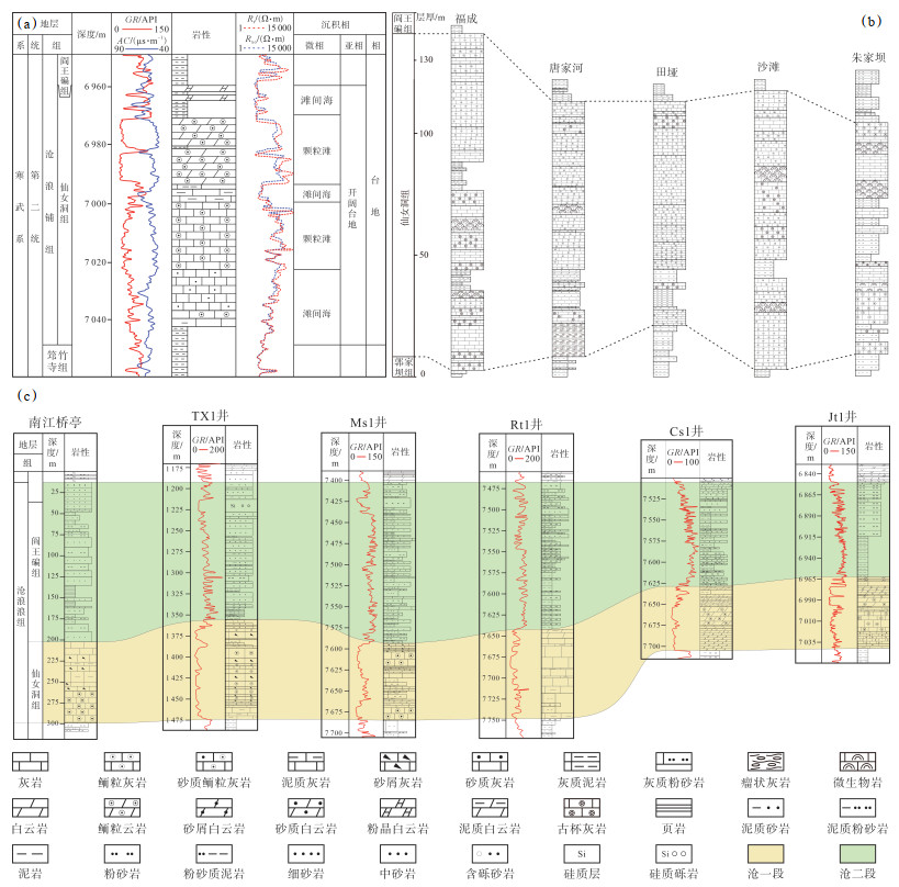 地层对比结果显示,研究区仙女洞组与沧浪铺组一段为等时对应关系(图 2,表 1)。在多期桐湾运动控制下的古地貌格局影响下[11],沧浪铺组岩性组合复杂,可细分为以碳酸盐岩为主的沧一段和以碎屑岩为主的沧二段(图 2c),沉积厚度65~ 600 m;具有显著相变特征,发育三角洲相、滨岸相、浅水陆棚相及斜坡相[4, 11, 28-29]。区域上,该组呈现“西侧以碎屑岩为主导、东向碳酸盐岩增多”的相带分异规律[31]。川北地区仙女洞组以鲕粒灰岩为主,夹薄层砂岩/粉砂岩/泥岩互层,顶部普遍发育白云岩化层段[21, 26, 28],向上渐变为阎王碥组砂泥岩组合(大致相当于盆地沧浪铺组中上段)(图 2)。