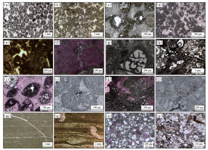 下载原图 图 3 四川盆地北缘寒武系仙女洞组岩石类型显微照片 (a)鲕粒灰岩,鲕粒呈点接触,粒间发育多期次亮晶方解石胶结物,含少量石英,唐家河剖面;(b)鲕粒灰岩,部分鲕粒发生白云石化作用,朱家坝剖面;(c)白云质鲕粒灰岩,鲕粒完全白云石化,粒间溶孔发育,田垭剖面;(d)微生物岩,附枝菌周缘孔隙被亮晶胶结物充填,有少量石英,唐家河剖面;(e)微生物岩,肾形菌间被亮晶方解石和灰泥充填,含有异地搬运鲕粒,唐家河剖面;(f)含砂云化叠层石,局部可见泥晶白云石颗粒,福成剖面;(g)古杯灰岩,古杯空腔被亮晶方解石充填,田垭剖面;(h)古杯灰岩,陆源碎屑含量增加,唐家河剖面;(i)白云质灰岩,鲕粒完全白云石化,泥—粉晶白云石未被染色,局部残余方解石,沙滩剖面;(j)白云质灰岩,唐家河剖面;(k)白云质灰岩,沥青在泥—粉晶白云石颗粒间充填,福成剖面;(l)白云质灰岩,强烈白云石化作用下,局部区域原始结构消失,唐家河剖面;(m)泥岩,发育未被充填的裂缝,福成剖面;(n)泥质粉砂岩,可见生物钻孔,田垭剖面;(o)含钙粉砂岩,钙质组分(红色部分)充填在粉砂级石英颗粒之间,福成剖面;(p)中—细砂岩,可见绿泥石颗粒(红色箭头),唐家河剖面。 Fig. 3 Micrographs of rocks from Cambrian Xiannüdong Formation in northern Sichuan Basin |