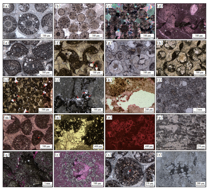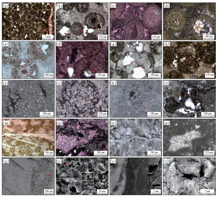 下载原图 图 4 四川盆地北缘寒武系仙女洞组碳酸盐岩储集空间类型特征 (a)粒间溶孔,田垭剖面;(b)粒间溶孔,田垭剖面;(c)粒间溶孔,显示早期的粒间溶孔被黑色沥青充填,染色薄片,福成剖面;(d)粒内溶孔,鲕粒内部发生选择性溶蚀,朱家坝剖面;(e)粒内溶孔,田垭剖面;(f)粒内溶孔(红色箭头)和粒间溶孔(白色箭头),染色薄片,福成剖面;(g)铸膜孔(红色箭头),保留鲕粒外部形态,田垭剖面;(h)晶间(溶)孔,田垭剖面;(i)晶间(溶)孔,被黑色沥青充填,福成剖面;(j)晶间(溶)孔,鲕粒白云石化,唐家河剖面;(k)晶间孔,被沥青充填,唐家河剖面;(l)裂缝和溶蚀孔(红色箭头),田垭剖面;(m)构造裂缝,田垭剖面;(n)沥青充填裂缝,周围可见泥—粉晶白云石颗粒,局部发育溶蚀孔,染色薄片,沙滩剖面;(o)未被充填的裂缝,唐家河剖面;(p)生物骨架孔隙,常被亮晶方解石充填,唐家河剖面;(q)粒内溶孔和晶间孔,鲕粒发生选择性溶蚀和白云石化作用;(r)微生物岩中的粒间溶孔;(s)溶蚀孔,在晶体边缘发育;(t)晶间溶孔,其中(q)—(t)样品来自唐家河剖面。 Fig. 4 Characteristics of carbonate reservoir space of Cambrian Xiannüdong Formation, northern Sichuan Basin |