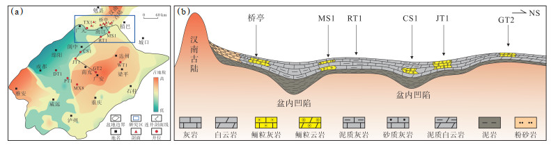 1 地质概况四川盆地是发育于上扬子克拉通基底之上的大型多旋回叠合盆地,其构造演化受北东向城口—房县断裂带和北西向龙门山断裂带的双重控制[16]。研究区主体位于四川盆地北缘汉南—米仓山古陆构造带周缘(图 1a);该古陆是由新元古代期间经历复杂构造活动的汉南古陆和米仓山隆起2个独立的陆块拼合而成[17]。研究区的构造古地理位置关键,西部与龙门山构造带相邻,东部接近大巴山褶皱带,北部与秦岭造山带及勉略缝合带相接,南端则与四川盆地相连[18]。地层发育方面,区内出露元古界至新生界完整层系,其中下寒武统受震旦纪末桐湾运动影响,与下伏地层普遍呈不整合接触[19]。