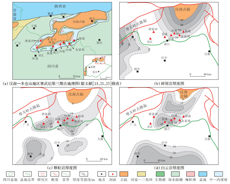 下载原图 图 7 四川盆地北缘寒武纪第三期古地理及仙女洞组岩性厚度图(据文献[13, 14, 21, 25]修改) Fig. 7 Paleogeography of Early Cambrian(stage 3)and lithological thickness of Xiannüdong Formation, northern Sichuan Basin |