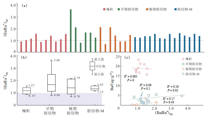 此外,陆源碎屑的输入对仙女洞组碳酸盐岩储层具有建设性作用。地化数据显示研究区碳酸盐组构普遍发育Eu正异常[(Eu/Eu*)SN >1.0](图 8a,8b)。通过 135Ba16O+对Eu151的干扰校正分析(图 8c),这异常可能并非测试干扰影响,而是真实地质意义信号。其成因可归因于双重来源:长石和热液[43-44]。一方面,Eu正异常可能反映了研究区强烈的溶蚀作用。研究区仙女洞组为碳酸盐岩夹碎屑岩的沉积模式,层内或层间混有大量陆源碎屑,这些物质以石英、长石和岩屑为主[13]。前人研究表明其物源主要有3个:汉南—米仓山古陆(镁铁质岩石)、西北碧口地块和西南康滇古陆(泥岩、变质砂岩和花岗岩类)[45-46]。仙女洞沉积期,河流搬运作用将古陆风化产物输送至研究区,混入了浅水区域的鲕粒纹层和微生物组构中。其中,富Eu矿物(长石或铁镁质岩)的加入或后期溶解都将影响周围碳酸盐组构的地化特征[46],这与研究区结果一致;另一方面,Eu正异常也可能反映了热液流体的侵入[47],有研究证明了汉南—米仓山古陆东缘仙女洞组发育构造控制的热液型白云岩[48],但并未在研究区发现更多热液活动的证据,因此,研究区普遍发育的Eu正异常可能是富Eu矿物溶蚀的结果,这对后期溶蚀孔隙的形成具有积极作用,有利于仙女洞组优质储层的形成。