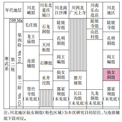 四川盆地沧浪铺组发育复杂的多物源沉积体系[4-5],作为紧邻下伏筇竹寺组优质烃源岩的重要储集单元,该层系具备源-储紧邻的成藏优势。现有研究证实,沧浪铺组发育优质白云岩储层,具备优越的成藏地质条件[6-7],其储集性能与独特的沉积环境密切关联。古地理重建表明,受康滇古陆与汉南—米仓山古陆双向物源供给影响,沧浪铺组沉积初期在川西地区普遍发育混积沉积[5]。这类混合沉积体系具有双重油气地质效应:一方面,通过细粒泥质夹层与粗粒碳酸盐岩的韵律性组合,组成高效生储盖配置[8],形成有效成藏体系[9];另一方面,碳酸盐组分与长石等易溶碎屑矿物的协同效应,在多期成岩流体作用下显著促进次生孔隙发育,有效改善储集性能[10]。鉴于沧浪铺组巨大的勘探潜力,许多学者对其展开了一系列相关研究,包括层序地层、储层特征、沉积、古地理环境及成藏演化等[4, 11],但仍然缺少对四川盆地北缘同时期沉积地层(如仙女洞组)的储层特征研究,这制约了四川盆地寒武系油气勘探有利区的预测和优选。因此,开展四川盆地北部仙女洞组的研究,对完善四川盆地寒武系油气成藏理论具有重要科学价值。
