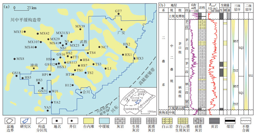 1 地质概况合川—潼南地区位于四川盆地川中平缓构造带东南翼部,面积约4 000 km2(图 1a)。早二叠世,四川盆地全面沉降,形成一套连续的茅口组海相碳酸盐岩沉积,研究区单井实钻厚度为150~220 m,自下而上可划分为茅一段、茅二段、茅三段[21-22]。茅口组沉积早期,海平面逐渐上升,形成以深灰—黑灰色泥质灰岩及含泥灰岩为主的茅一段台地相沉积,具有典型的“眼球眼皮”构造[23];茅二段沉积时期,海平面升至最高位,随后开始发生海退,进入成滩期,水体能量较强,发育中高能台内滩相沉积,形成一套白云岩、白云质灰岩及粒屑灰岩沉积建造[24];茅三段沉积时期,海平面继续下降,广泛发育台内高能薄层生屑滩,形成以浅水生物碎屑灰岩为主的沉积[25];茅口组沉积中晚期,区内受东吴运动及峨眉地幔柱活动影响迅速抬升,茅三段发生严重溶蚀[26],残余厚度较小,为25~60 m,与上覆龙潭组泥岩之间呈不整合接触(图 1b)。