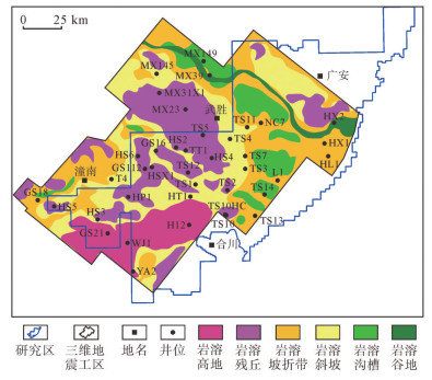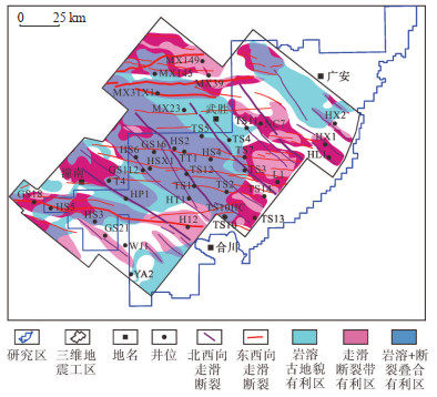 通过对合川—潼南地区茅口组储层特征和油气成藏过程的研究,明确了茅三段灰岩岩溶储层发育受表生岩溶作用和构造断裂活动的共同控制。以往研究揭示了岩溶古地貌对岩溶储层厚度和充填程度具有明显影响,岩溶残丘与岩溶斜坡为有效储层发育的岩溶有利区[37-38],再叠合走滑断裂带控制的构造有利区,即可初步预测研究区茅三段灰岩岩溶储层勘探有利区的分布范围。