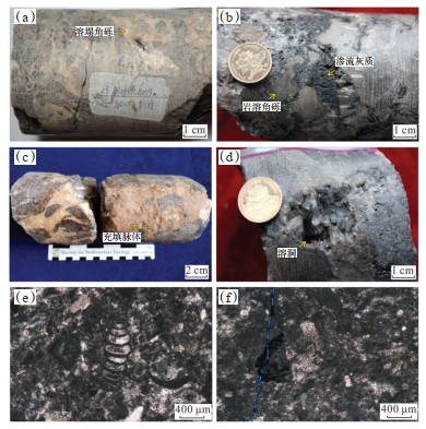 川中合川—潼南地区茅三段岩心观察和镜下薄片鉴定结果(图 2)表明,茅三段灰岩岩性较为单一,为亮晶—泥微晶生屑灰岩,呈暗灰—灰色,可见溶塌角砾、岩溶角砾、渗流灰质、充填脉体及溶洞等构造,镜下见灰泥基质及亮晶方解石胶结,同时可见大量介壳类、有孔虫、珊瑚等生屑颗粒。多种岩溶构造、灰泥混合基质和大量水生生物碎屑反映了茅三段灰岩沉积时期的浅水环境,揭示了其早成岩期经历的表生岩溶过程。