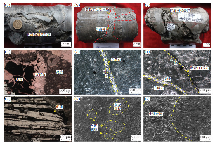 受大量同沉积断裂活动与强烈岩溶作用的叠加影响,研究区茅三段灰岩岩溶储层发育以裂缝及溶蚀孔洞为主的储集空间。裂缝多为高角度及网状构造缝,见明显的沿缝扩溶现象,规模发育扩溶缝洞,充填程度较高,大部分被泥质、沥青、次生方解石与白云石充填—半充填(图 3a—3g),残留空间可作为有效岩溶储层。溶蚀孔洞大多发育于灰泥基质及生物碎屑中,前者以灰泥基质颗粒间的微孔隙形成的扩溶空间为主,后者则主要为内部方解石晶粒的晶间缝和晶格缺陷扩溶空间(图 3h,3i)。