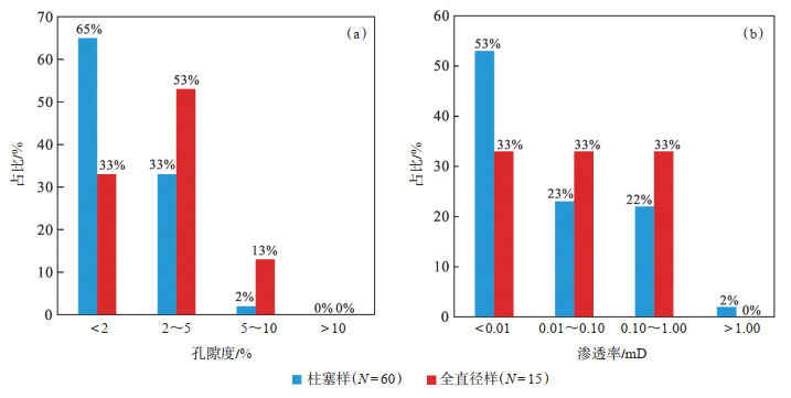 根据现行行业标准《油气储层评价方法:SY/T 6285—2011》[27],对TT1井和GS112井共计60个柱塞岩心样品和15个全直径岩心样品物性分析结果进行统计(图 4),发现灰岩岩溶储层物性普遍较差,样品实测平均孔隙度为2.04%,其中,柱塞样品孔隙度为0.59%~7.29%,平均值为1.84%,孔隙度小于5.00%的样品占98%;全直径样品孔隙度为0.88%~ 5.93%,平均值为2.81%,孔隙度小于5.00%的样品占87%(图 4a)。样品平均渗透率为0.210 mD,其中,柱塞样品渗透率为0.001~7.710 mD,平均值为0.231 mD,渗透率小于1.000 mD的样品占98%;全直径样品渗透率为0.001~0.627 mD,平均值为0.126 mD,所有样品渗透率均小于1.000 mD(图 4b)。总体来看,研究区茅三段灰岩岩溶储层整体为特低孔、特低渗碳酸盐岩储层。
