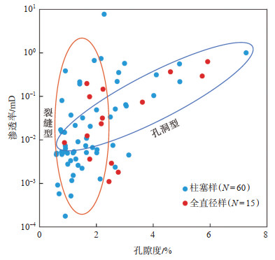 基于上述样品物性参数,将不同岩心类别绘制成渗透率-孔隙度交会图(图 5),大部分样品的渗透率在孔隙度变化不大的情况下明显增加,表现出显著的裂缝型特征;小部分样品孔隙度与渗透率呈正相关性,具备孔洞型储层特点。结合对岩心样品的宏微观观察认识,认为研究区茅三段灰岩岩溶储层为以裂缝为主的缝洞型储层。