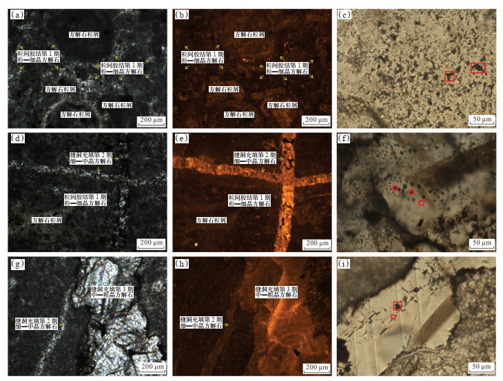 根据包裹体薄片岩相学特征的显微观察及流体包裹体均一温度分析结果(图 6),研究区茅三段存在3期矿物充填,在这3期矿物中分别识别出3期油气包裹体,发育丰度均较高,第1期为粒间胶结粉—细晶方解石,阴极发光为暗褐色光,发育大量成群分布的深褐色沥青与液烃包裹体,大小为2 μm×3 μm~ 8 μm×15 μm,均一温度为90~106 ℃(图 6a—6c);第2期为缝洞充填细—中晶方解石,阴极发光为暗橙色—橙色光,发育大量成带分布的深褐色沥青、液烃包裹体以及无色—深灰色气烃包裹体,大小为2 μm×2 μm~6 μm×13 μm,均一温度为111~ 136 ℃(图 6d—6f);第3期为缝洞充填中—粗晶方解石,阴极发光为橙色光,发育成带分布的大量无色—深灰色气烃包裹体及少量深褐色沥青包裹体,大小为2 μm×3 μm~12 μm×13 μm,均一温度为173~193 ℃(图 6g—6i)。