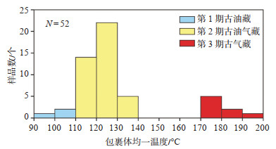 受不同时期的埋藏深度和地温梯度等因素影响,不同油气充注期次形成的包裹体特征有明显差异。研究区茅三段流体包裹体的均一温度分析结果(图 7)显示,经历了3期油气充注过程,存在3个温度区间,第1期为古油藏充注,包裹体均一温度为90~106 ℃,指示液烃充注阶段;第2期为古油气藏充注,包裹体均一温度为111~136 ℃,指示气液烃充注阶段;第3期为古气藏充注,包裹体均一温度为173~193 ℃,指示古油藏裂解阶段,为气藏的主要形成期。