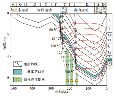 在明确油气充注情况的基础上,使用PetroMod盆地模拟软件,结合实测Ro值校正古地温与古热流模型,恢复TT1井的埋藏史与热演化史,将实验测得的3个油气充注期次的包裹体均一温度进行投影,即可确定油气充注的地质时期。结果(图 8)显示,茅三段3期油气充注分别对应3个关键地质时期,第1期为液烃充注的古油藏形成时期,发生于晚三叠世;第2期为气液烃充注的古油气藏形成时期,发生于早侏罗世;第3期为古气藏形成时期,先存古油藏完全裂解,演化程度达到最大,发生于中侏罗世—晚侏罗世。