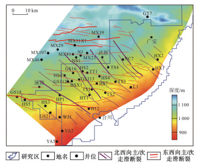 下载原图 图 9 川中合川—潼南地区侏罗纪始二叠系茅口组顶面构造形态及走滑断裂分布 Fig. 9 Tectonic morphology and strike-slip fault distribution of the top surface of Permian Maokou Formation at the beginning of Jurassic period of Hechuan-Tongnan area, central Sichuan Basin |