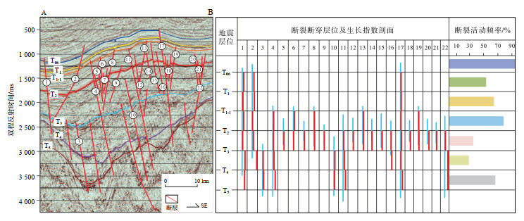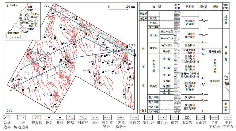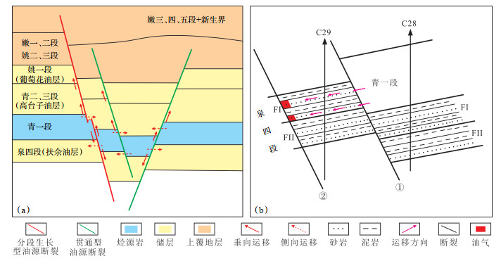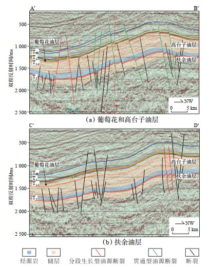 松辽盆地是我国油气资源最丰富的含油气盆地之一,受断裂垂向输导作用控制,中浅层油气具有多层系分布特征,主要分布在泉头组扶余油层(包括FⅠ,FⅡ,FⅢ,FⅣ等油组)、青山口组高台子油层及姚家组葡萄花油层。断裂作为油气垂向运移的关键通道,其输导机制及控藏作用已成为研究的热点问题[1-2]。诸多学者针对松辽盆地断裂系统开展了大量研究,并在断层识别及特征分析等方面取得显著进展[3]。松辽盆地断裂演化与盆地动力学相关,坳陷期伸展断裂盆地进入沉降阶段,以正断层为主,主导中浅层油气分布[4],反转期断裂通过挤压应力改造早期断层,形成逆冲构造和裂缝,促进油气再运移与聚集。不同时期、不同性质的断层组合形成了复杂的断裂网络,其活动强度与活动期次变化对油气聚集和分布具有重要影响[3]。研究表明,松辽盆地断层作为重要的油气输导通道,具有周期性幕式运移特征[5],油气运移时期和断层活动时期匹配较好,有利于断层输导油气,而油气运移时期停止活动的断层通常对油气具有一定的封闭和遮挡作用[6]。扶余油层是典型的上生下储式油气藏,充足的油源与高异常压力为油气运移提供了动力条件,而断裂则是连接储层与上覆烃源层的重要输导通道[5, 7]。高台子油层和葡萄花油层则属于典型的下生上储式油气藏,油源断裂构成其垂向输导的优势通道,断裂密集带控制着油气的富集[8]。尽管关于断裂在油气垂向输导中的作用已有大量研究并取得一定成果,但这些研究主要集中在单一地区下生上储或上生下储成藏组合的研究,缺乏对同一区域内断裂在多层系(包括烃源岩上部与下部含油层位)输导作用的详细研究,制约了油气多层系分布地区的资源评价和勘探部署。