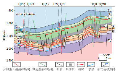综上所述,研究区断裂输导作用控制研究区油气藏分布特征(图中为了更好的表述断层和扶余油层油水分布关系,对泉四段纵向比例进行了调整)(图 10)。受分段生长型油源断裂控制的井,源岩生成油气后沿分段生长型油源断裂“倒灌”运移至扶余油层或纵向向上运移,因此在烃源岩上下均显示油层,且FⅠ,FⅡ,FⅢ,FⅣ等油组均含油;当断裂错断使源岩和储层对接时,油气进行侧向运移,向上侧接运移使高台子油层含油,向下侧接主要使FⅠ油组和FⅡ油组均有油气分布,少数FⅢ油组含油;受贯通型油源断裂控制的井,油气沿断裂纵向向上运移,在烃源岩上部显示为油层,最终在相应的各类圈闭中聚集成藏。以上分析与研究层位内已发现油气分布相吻合,根据钻井资料及三维地震资料显示,Q152—X260井钻遇至泉四段,且断裂错断仅使青一段源岩与FⅠ油组、FⅡ油组对接,而实际上F Ⅲ油组和FⅣ油组均有油气显示,说明烃源岩生成油气后倒灌运移至扶余油层。2种油源断裂共同控制油气分布,从而促进了油气的多层位聚集。因此,对于松辽盆地南部余字井地区而言,只有在烃源岩大量生排烃时期就已存在并具有良好渗流能力的输导体系,才有利于油气运聚[42]。输导通道的好坏直接控制着油气能否聚集成藏,即断穿T2反射层的油源断裂越发育,从青一段源岩向下“倒灌”运移进入扶余油层、向上进入高台子和葡萄花油层中的油越多,进而沿着砂体向构造高部位聚集成藏的油越多,断裂活动形成的断块圈闭是松辽盆地南部中浅层油气聚集的主要场所。