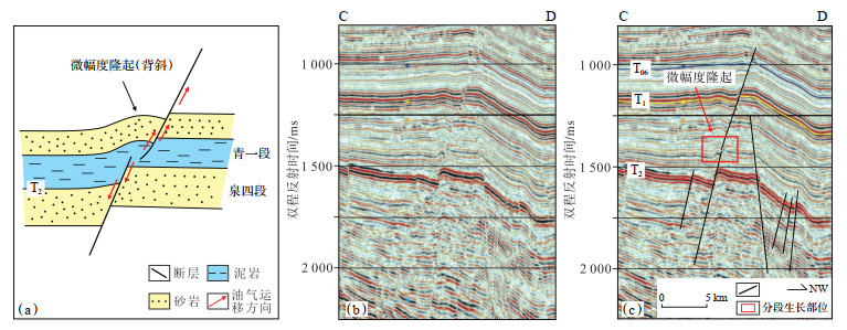 在松辽盆地内,断裂在青一段塑性泥岩地层分段生长是一种常见的地质现象,由于岩石的能干性差异,断层倾向于在脆性地层中成核,而不是在塑性泥岩层或砂泥互层中。断层在向上传播过程中,青一段泥岩阻止下部断层向上传播,遇到塑性地层会形成强制褶皱[23],这就导致了断层垂向分段生长[24-25]。根据地震剖面显示,分段生长是断层在垂向上表现为上下分段现象,且叠覆区内地层倾角发生明显旋转变化[26]。在地震剖面上可观察到:部分断层在青一段地层内倾角发生明显变化,同时分段生长部位存在明显的微幅度隆起(图 4),分段生长点位于青一段地层,下段沟通青一段和泉四段,上段沟通青一段及上覆地层,使得油气既能向下运移至泉四段,也能向上运移。综上所述,可以将油源断裂划分为分段生长型和贯通型。根据油源断裂特征刻画了余字井地区中浅层油源断裂分布,结果显示,油源断裂主要分布在断裂密集带边部,为断裂密集带的边界断裂(图 5)。对于葡萄花油层和高台子油层,油源断裂主要为贯通型油源断裂和分段生长型油源断裂(图 5);而扶余油层油源断裂则主要为分段生长型油源断裂(图 5b)。