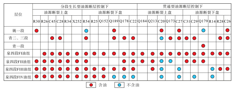 对于“倒灌”运移,不同类型的油源断裂“倒灌”输导的能力不同。贯通型油源断裂更易发生“向上”运移,而分段生长型油源断裂受青一段塑性泥岩层影响,在断裂分段部位不连通,即分段生长型油源断裂上段向上输导油气,下段向下倒灌运移油气。研究区扶余油层已发现油气显示,断裂带内扶余油层无源储对接,但断裂带内仍存在油气富集,此外,断裂带外未发生源储对接的下部油组同样有油气富集(图 7)。根据含油层位及油源断裂特征,发现这些含油井主要分布在分段生长型油源断裂附近。研究表明,青一段暗色泥岩显示出单层厚度大,沉积速率快的特征,目前普遍欠压实,具有超压,一般为3~20 MPa[37]。当超压大于青一段泥岩围压10 MPa时开始释放异常高压流体[38],可以为“倒灌”运移提供动力。此外,青山口组源岩在嫩江组沉积末期开始生烃,明水组沉积末期、古近系和新近系沉积末期达到生烃高峰[37],可以为油气向下运移提供充足的原料。结合区域构造演化特征,研究区断裂在嫩江组沉积末期、明水组沉积末期活动,为油气倒灌运移提供输导通道,油气通过分段生长型油源断裂向下运移至各个油组。因此,倒灌运移具有控制扶余油层油气多层分布的特征。