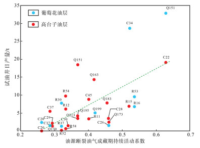 然而,并非所有的油源断裂输导油气能力都相同,不同油源断裂输导油气能力存在明显差异[39],对于正断层输导油气地区,通常用油气成藏期断层活动强度表征断裂输导油气能力[40],但松辽盆地南部晚期经历了3期构造反转[10],且断裂普遍较小,所以该方法不适用于该地区。因此,引入成藏期油源断裂持续活动的时间来表征油源断裂活动性[41],油源断裂在油气成藏期持续活动时间越长,输导油气能力越强。对余字井地区油源断裂活动性进行表征,主要通过油源断裂油气成藏期持续活动系数来计算。该系数为油源断裂断穿至T06反射层的长度与T06反射层以上总长度的比值,而对于表现为断层相关褶皱特征的油源断裂来说,该系数为褶皱隆起高度与T06反射层以上总长度的比值。通过油源断裂油气成藏期持续活动系数与试油井日产油数据的关系表明(图 9),余字井地区的油源断裂在成藏期持续活动系数与高台子、葡萄花油层试油储量具有一定的正相关关系。受研究区晚期成藏的影响,油源断裂油气成藏期持续活动系数越大,日产油越高,油源断裂输导能力越强。