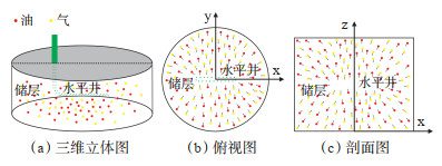 1 物理模型与假设条件水平井油气两相流物理模型主要分为水平井和储层两部分。水平井厚度h、水平渗透率kho、垂向渗透率kve、孔隙度ϕ,水平段长度L,以产量q定产量生产,考虑井筒油气两相密度差异引起的变井筒储集效应和近井地带的储层伤害引起的表皮效应。储层为均质等厚储层,储层流体为油气两相,含气饱和度和含油饱和度分别为Sg和So,遵循等温达西定律;水平井定产量生产前,储层的初始压力为pi,均匀分布;考虑水平面无限大边界条件及储层顶面和底面为不渗透边界条件,储层存在渗透率应力效应,储层渗透率随有效应力呈指数式变化关系。基于此,设置圆柱形平面径向流的储层物理模型,如图 1所示。