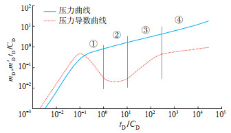 设置水平井油气两相流物理模型参数(表 1),并绘制考虑应力敏感的水平井油气两相流试井理论曲线,以tD/CD为横坐标(tD为无因次生产时间;CD为无因次井筒储集系数);以mD,mD'tD/CD为纵坐标(mwD为无因次拟压力,mwD'为无因次拟压力导数)。结果(图 2)显示:曲线上可识别4个主要的流动阶段,第①阶段为变井储和表皮效应影响段,与定井储效应的早期压力和压力导数曲线重合且呈单位斜率的直线特征[24]不同,受变井储的影响,早期压力和压力导数曲线呈分离状态,受表皮效应的影响,压力导数曲线呈“驼峰”状;第②阶段,早期径向流阶段;第③阶段,水平井线性流阶段;第④阶段,晚期拟径向流阶段。