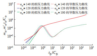 3.2.1 无因次变井储系数αD和CϕD维持LD = 6,γD = 0.06,CϕD = -3,So = 10% 不变,依次设置αD值分别为100,120和140,分别绘制试井曲线,分析αD的敏感性。结果(图 3)显示,αD越大,其压力导数曲线的“驼峰”越靠右,指示变井储效应持续的时间就越长。