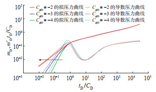 维持LD =6,γD = 0.06,αD = 100,So = 10% 不变,依次设置CϕD值为100,120和140,分别绘制试井曲线。结果(图 4)显示:CϕD越小,其压力导数曲线的“驼峰”位置就越高。