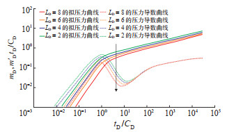 3.2.2 无因次水平井长度LD维持CϕD = -3,γD = 0.06,αD = 100,So = 10% 不变,依次设置LD值为2,4,6和8,分别绘制试井曲线。结果(图 5)显示:相同产量、相同生产时间条件下,LD越大,压力降落幅度越小,试井压力曲线位置越低,指示泄流面积越大,地层供给能力越强,主要影响第②阶段和第③阶段。