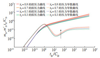 维持LD =6,CϕD = -3,γD = 0.06,αD = 100不变,依次设置So值为30%,50%,70% 和90%,分别绘制试井曲线。结果(图 7)显示:相同生产时间条件下,So越大,压力降落幅度越大,试井压力曲线位置越高,说明So越大,原油流动能力弱于气体的流动能力,油气两相流流动阻力越大。