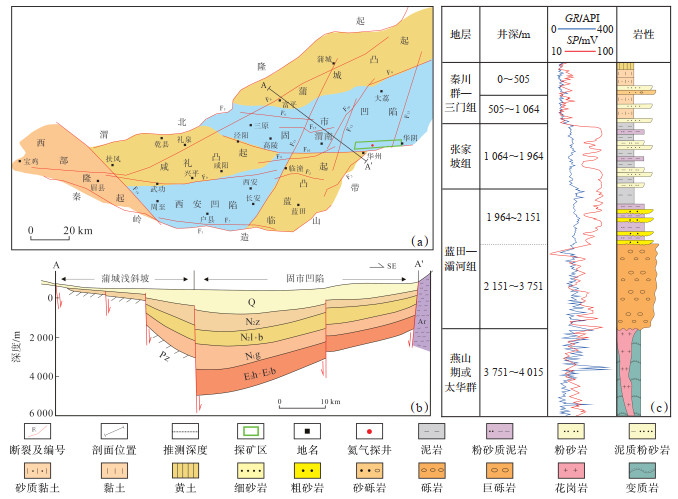 下载原图 图 1 渭河盆地构造单元划分(a)、地层剖面(b)及氦气探井岩性地层综合柱状图(c)(据文献[25, 27]修改) Fig. 1 Division of structural units(a), stratigraphic profile (b), and stratigraphic column of helium exploration well (c) of Weihe Basin |
