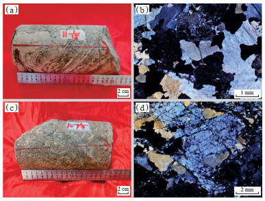 下载原图 图 2 渭河盆地氦气探井钻遇变质岩、花岗岩岩心及显微照片 (a)太古界太华群片麻岩,4 010 m; (b)太古界太华群变晶结构片麻岩,4 010 m; (c)燕山期花岗岩,3 767 m; (d)燕山期花岗结构花岗岩,3 767 m。 Fig. 2 Cores and micrographs of metamorphic and igneous rocks drilled in helium exploration well in Weihe Basin |