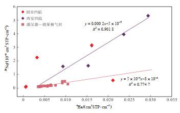 下载原图 图 3 渭河盆地地热井井口富氦天然气样品 4He与 20Ne交会图(据文献[39]修改) Fig. 3 Crossplot of 20Ne and 4He of helium-rich natural gas samples at wellhead of geothermal wells in Weihe Basin |