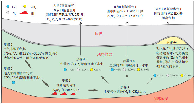 地下水系统及载体气直接控制着氦气的富集、运移方向及保存条件,是氦气成藏的基础[36]。通常,相对静止的地下水会使生氦矿物、岩石中释放出来的氦及时保存在氦源岩附近的孔隙水中并不断富集,进而使得孔隙水中的氦气含量不断增加[36]。对渭河盆地多口地热井井口气样品开展稀有气体同位素分析发现,富氦天然气样品的 20Ne与4He值呈良好的线性正相关关系,与潘汉德—胡果顿气田天然气样品中 4He与 20Ne值变化趋势存在明显差异[34](图 3),指示渭河盆地富氦天然气与地下水关系密切,即空气饱和地表水运移到地下,氦气等空气来源的稀有气体溶解于地下水中,随地下水系统循环迁移。当地下水与石油发生油-水瑞利分馏时,主要气体组分加入流体系统中,大量的CH4气体呈饱和状态并溶于地下水后形成游离相,而持续的气-水交换使得大量的He在气相中富集,形成C组气(高氦游离气),即富氦天然气藏[32] (图 4)。华州探区深部4He通量具有高异常或地下水流速低的特点,这表明地层孔隙-孔隙水是氦气运移和富集的重要载体[39]。