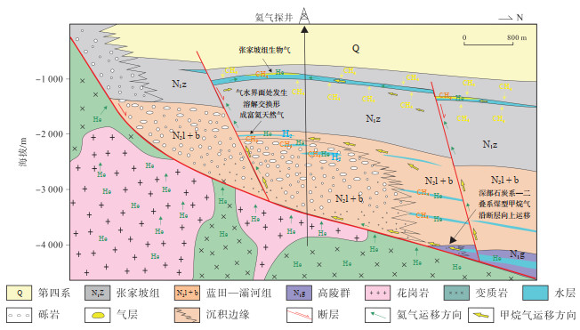 基于上述问题,陕西燃气集团在华州—潼关氦气远景区采用油气井完井工艺,顺利完成了中国首口氦气专属探井的钻探工程,钻遇地层包括新生界蓝田—灞河组、张家坡组、三门组和秦川群及深部燕山期花岗岩和太古宙变质岩基底。勘探成果显示: ①华州探区发育较大规模圈闭,氦气探井的新生界地层深度明显大于邻近地热井及石油探井钻遇地层,且地层高差随深度的增加而增大; ②在山前中深层处钻遇巨厚砾岩层(厚度约1 600 m),自下而上砾岩的粒度变大,整体呈逆粒序; ③钻穿新生界盖层,揭示基底上部为花岗岩侵入体,底部为太古宙片麻岩,为重要的氦源岩; ④测井和录井显示良好,氦气及全烃异常段发育超百米,氦气气测异常最高达45×10-6,全烃气测异常值最高可达60 000×10-6; 压裂试气过程中未达到稳定状态时,2 366~2 452 m深度甲烷气体积分数为1.03%~26.06%,氦气体积分数为(90~17 000)×10-6,并含有氢气等其他原生气体; 测井资料显示存在多个可疑气水同层和含气水层。结合前人的研究成果及已获得的大量实物资料,认为华州探区的富氦天然气的成藏受控于多种基础地质因素(图 5),主要表现为氦源岩基底、深大断裂、有效封盖条件等,与目前已建立的渭河盆地氦气成藏模式基本一致。