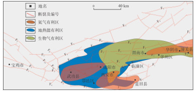 综合渭河盆地地热流体资源,新近系张家坡组烃源岩及花岗岩侵入体的分布范围,切割花岗岩体的深大断裂及储、盖层分布特征等,可大致明确地热能、生物气、氦气3类资源在纵向及平面上相互叠置,共同构成了较为复杂的资源赋存体系[18]。根据不同区带的深度、层位及平面展布规律,可大致划定三大有利区带(图 6),其中,华州—潼关地区可作为多资源综合勘探与开发的重要目标区域[18]。