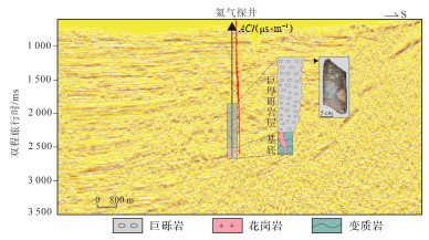 4.1 物探方法技术渭河盆地地质条件复杂,地球物理勘探程度较低、解释难度大,主要表现: ①发育NE和SN向等多组断裂体系,至今未部署三维地震,仅开展了二维地震勘探,断点组合分析难度大、圈闭落实程度低,无法进行三维属性分析与立体储层预测,勘探风险较大; ②人口密度大、交通网络发达、背景噪音复杂、去噪技术难度大,地震资料的采集及后期处理难度大; ③深部基底与勘探的主要目的层(新近系)距离远,花岗岩、深部断层识别及精准偏移归位处理难度大,影响了氦源岩的有效评价、深部断层体系及构造圈闭的准确识别。以华州探区为例,从氦气探井的某条地震测线剖面,可初步识别深部发育的断层体系及地层展布,但难以区分氦源岩(花岗岩与变质岩)和呈不整合接触关系覆盖于基底之上的巨厚砾岩层(图 7); ④陆相断陷盆地新生界沉积地层非均质性强,特别是盆地边缘相带变化快,二维地震技术无法有效区分岩性岩相变化及精确小型构造,对井位部署造成困扰。