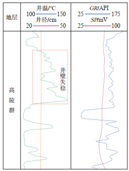 下载原图 图 8 华州探区氦气探井高陵群井壁失稳测井曲线示意图 Fig. 8 Diagram of wellbore instablity logging curves of Gaoling Group of helium exploration well in Huazhou exploration area |
