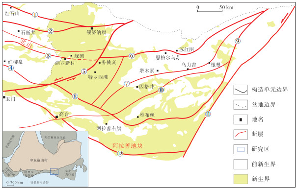下载原图 图 1 银额盆地构造位置 注: ①. 红石山断裂带; ②. 明水—公路井断裂带; ③. 红柳河—牛圈子—洗肠井断裂; ④. 孤山—红柳泉断裂; ⑤. 阿尔金断裂带; ⑥. 恩格尔乌苏断裂带; ⑦. 查干础鲁断裂; ⑧. 北大山北麓断裂; ⑨. 吉兰泰断裂; ⑩. 雅布赖—哈拉乌山断裂; ⑪. 狼山西麓断裂; ⑫. 龙首山南缘—察汗布鲁格断裂带。 Fig. 1 Structural location of Yin'e Basin |